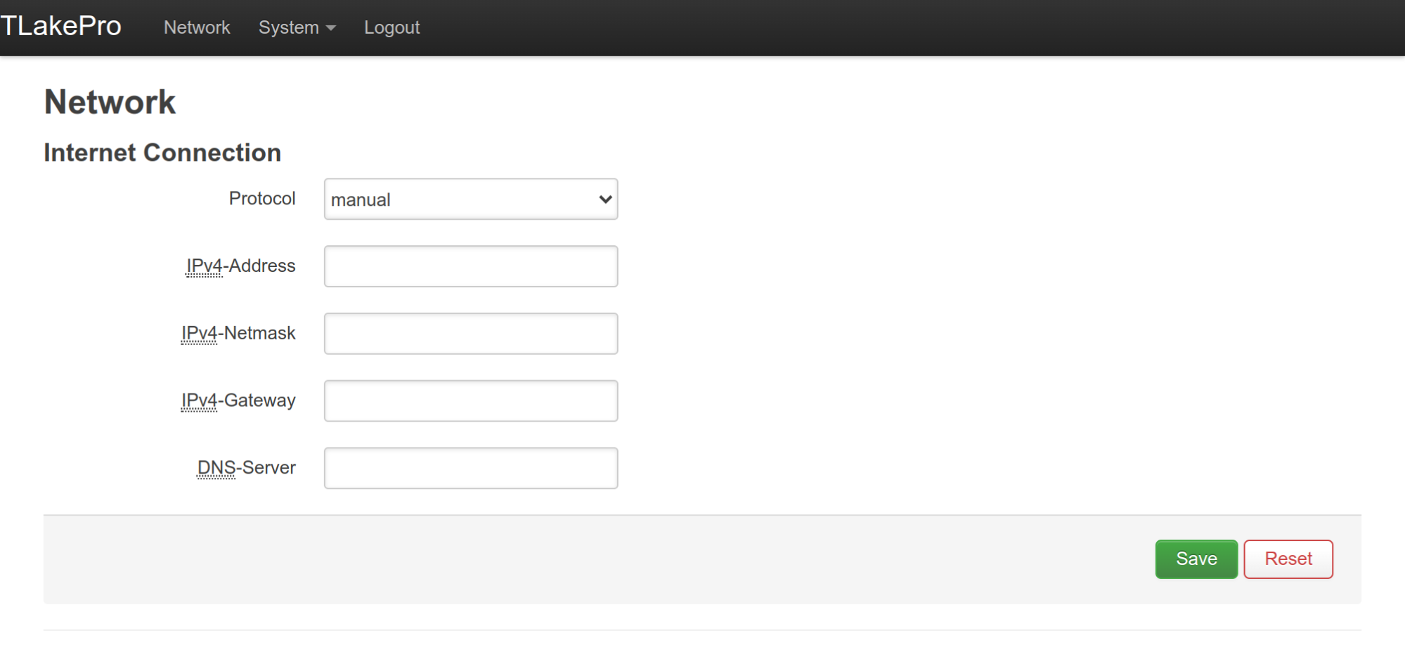 В форме можно выбрать либо вариант подключения "automatic". В этом случае БС запросит параметры подключения к интернет по протоколу DHCP. Либо можно выбрать вариант "manual", в этом случае нужно будет заполнить значения "IPv4-Address", "IPv4-Netmask", "IPv4-Gateway", "DNS-Server". После настройки новых параметров web интерфейс может стать недоступен. Для повторного входа может понадобиться настроить IP связность с учётом новых настроек на БС.